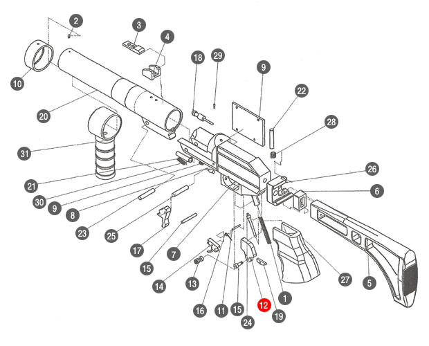29 Firing pin bolt 30 Empty shell ejection lever 31 Front grip